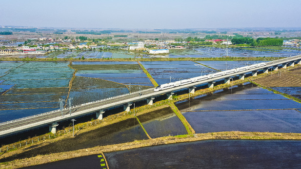 在哈牡高鐵線上,一列動(dòng)車組列車正從稻田間駛過。資料照片