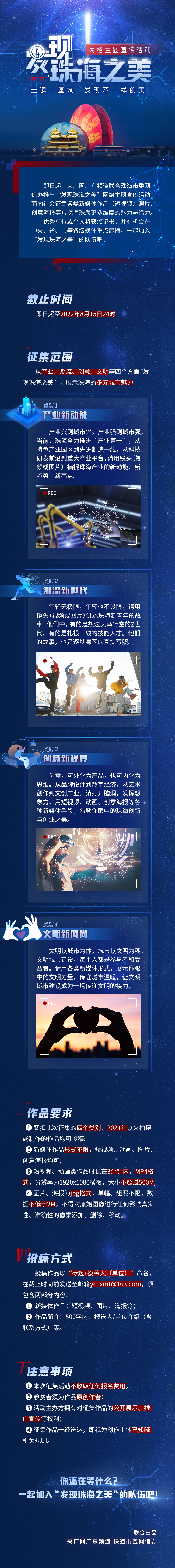 即日起,央廣網(wǎng)廣東頻道聯(lián)合珠海市委網(wǎng)信辦啟動“發(fā)現(xiàn)珠海之美”網(wǎng)絡主題宣傳活動,面向社會征集產(chǎn)業(yè)科技、時尚潮流、創(chuàng)新創(chuàng)意、文明風尚等四方面的新媒體作品,形式包括短視頻、圖片、海報等,優(yōu)秀作品將在中央、省、市等各級媒體重點展播。