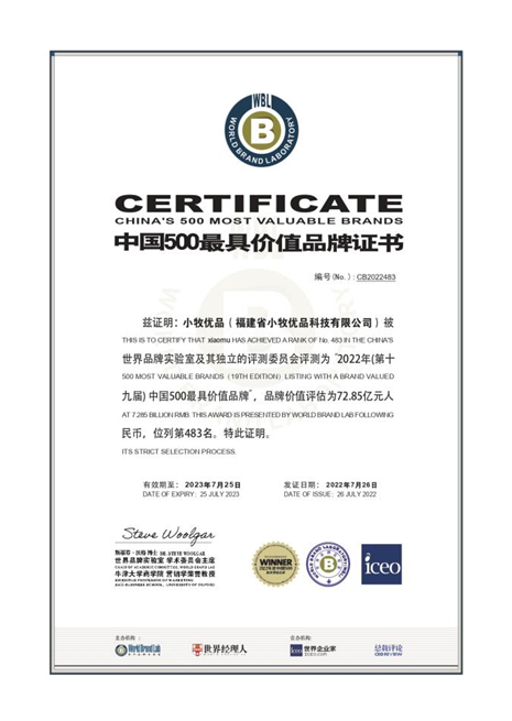 7月26日,由世界品牌實(shí)驗(yàn)室(World Brand Lab)主辦的(第十九屆)“世界品牌大會(huì)”在北京舉辦,重磅發(fā)布2022年《中國(guó)500最具價(jià)值品牌》榜單,小牧優(yōu)品以72.85億的品牌價(jià)值榮耀上榜,再展風(fēng)采。