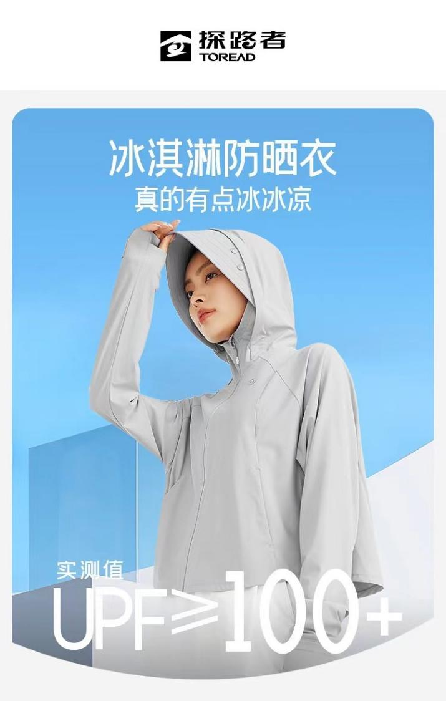 以探路者推出的“夏日全能王冰淇淋防曬衣”為例,品牌官方數(shù)據(jù)顯示其采用的TiEF SKIN-X2蝶影仿生雙重防曬技術(shù)可有效阻隔95%的紫外線,面、頸、手全包裹達(dá)到全方位防護(hù),與此同時(shí),接觸瞬間涼感系數(shù)為0.24,遠(yuǎn)超國際標(biāo)準(zhǔn)60%;外形設(shè)計(jì)上,探路者對(duì)此系列產(chǎn)品采用了時(shí)下流行的冰淇淋色系,改變了常規(guī)防曬衣外形缺乏時(shí)尚元素的短板……