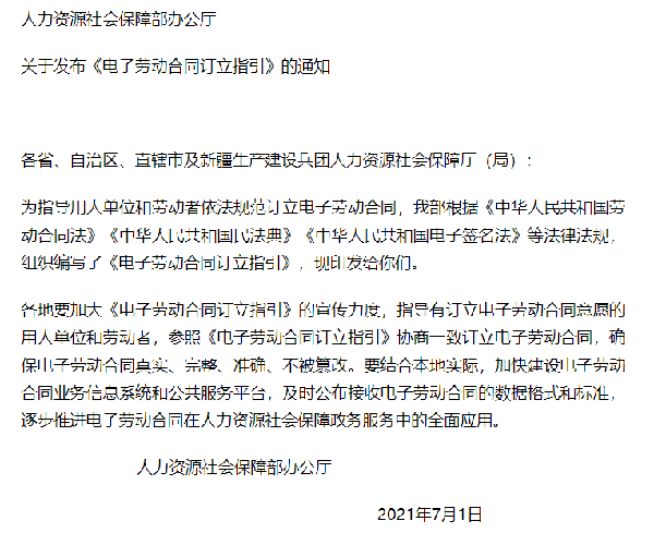 人力資源社會(huì)保障部辦公廳在2021年7月發(fā)布《電子勞動(dòng)合同訂立指引》的通知,如下: