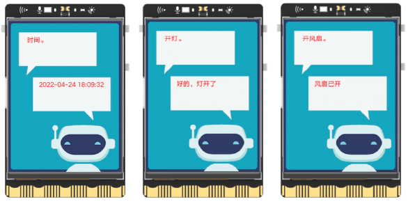 具體功能和操作如下,首先,將LED燈、風(fēng)扇外接到行空版上,之后給行空板配置網(wǎng)絡(luò),接著編寫并運行程序,在行空版屏幕上顯示背景圖和初始信息后,按下板載按鍵錄制語音,等待行空板依據(jù)程序自動將語音上傳至百度語音平臺并返回得到語音對應(yīng)的文字內(nèi)容,隨后對文字內(nèi)容進行判別,當其中有“時間”兩個字時,自動檢測系統(tǒng)的時間并更新顯示在行空板的屏幕上,而當文字內(nèi)容中有“開燈”、“關(guān)燈”、“開風(fēng)扇”、“關(guān)風(fēng)扇”、“開鬧鐘”、“關(guān)鬧鐘”等信息時,行空板控制LED等、風(fēng)扇、板載蜂鳴器執(zhí)行相應(yīng)的操作。