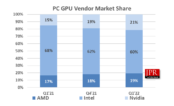 對于GPU,Intel自然是不陌生的,在PC顯卡市場上其實一直占據(jù)著領(lǐng)先地位。根據(jù)權(quán)威市調(diào)機(jī)構(gòu)Jon Peddie Research的數(shù)據(jù),2021年第一季度,Intel在PC GPU顯卡市場上的份額高達(dá)68%,2022年第一季度依然有60%。