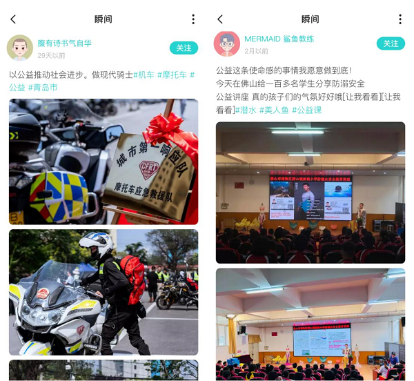 用戶@腹有詩書氣自華選擇做一位現(xiàn)代騎士,他加入了“摩托車應(yīng)急救援隊”,讓愛心馳騁在路上;@MERMAID鯊魚教練則用自己的所學(xué),給學(xué)生分享防溺安全知識,守護者孩子們的健康成長;攝影愛好者@愛攝影愛樂山,以公益拍攝的形式,帶領(lǐng)大家走進大山,看見更多渴望知識的孩子;用戶@土木人小王則用表演、陪伴,為計生特殊家庭帶來溫暖。