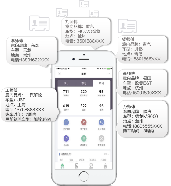 (圖為滿幫集團(tuán)面向經(jīng)銷商推出的線索管理工具“滿車寶”)
