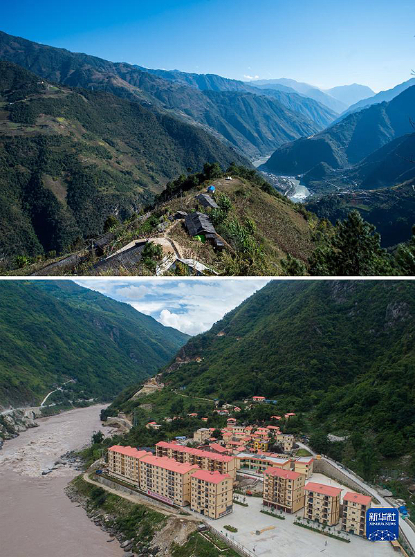 拼版照片:上圖是云南福貢縣匹河鄉(xiāng)托坪村一景(2016年11月25日攝);下圖是搬遷到怒江邊的托坪村五湖易地扶貧搬遷安置點新村(2019年6月25日攝,無人機照片)。新華社記者 胡超 攝