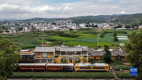 游客在云南省建水縣乘坐米軌小火車來到鄉(xiāng)會橋站游覽(2022年7月1日攝,無人機照片)。新華社記者 胡超 攝