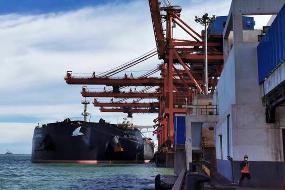 近日,承載廣西供應(yīng)鏈服務(wù)集團(tuán)進(jìn)口的5.72萬(wàn)噸菲律賓鎳礦的貨輪,靠泊在山東嵐橋港并卸貨。資料照片