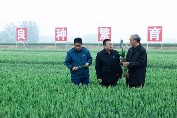 河北省小麥育種首席專家郭進考(右一)和同事在察看麥苗生長情況。受訪者供圖