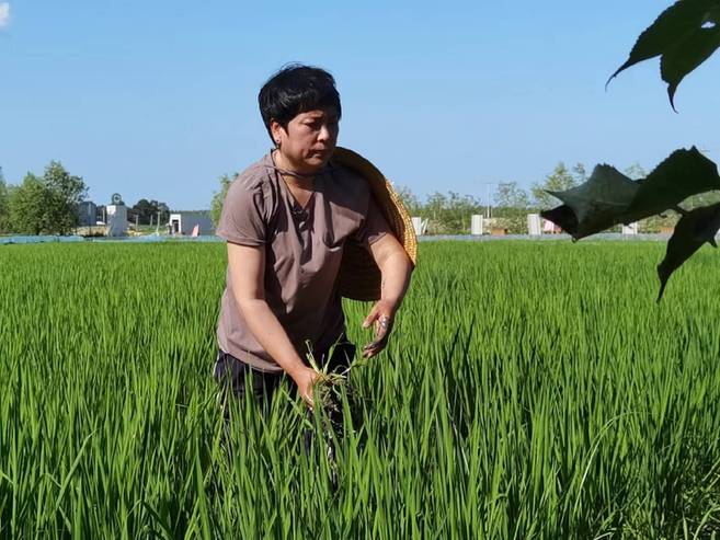 白城市鎮(zhèn)賚縣慶江種養(yǎng)殖農(nóng)民專(zhuān)業(yè)合作社經(jīng)理張瑞平在田中清理水藻。(潘晟昱 攝)