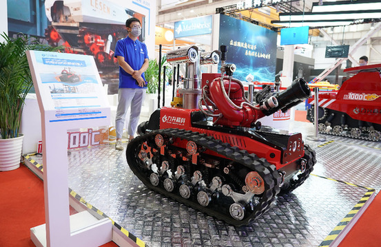 這是在2022世界機(jī)器人博覽會(huì)“機(jī)器人+制造”展區(qū)現(xiàn)場(chǎng)拍攝的防爆消防偵察機(jī)器人(8月19日攝)。