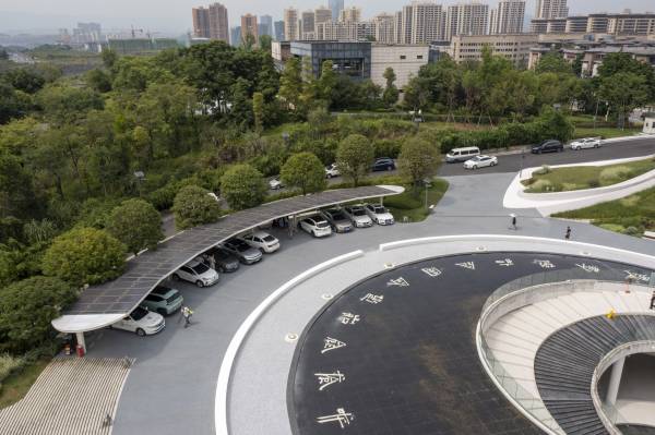 已建成投用的重慶首座光伏充電發(fā)用一體充電站(無人機照片)。記者 劉潺 攝