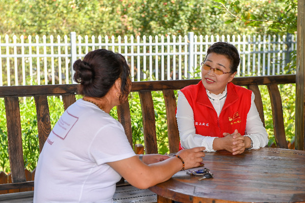 8月24日,吳亞琴(右)與團山街道長山花園社區(qū)的樓棟黨支部書記李杰聊天。新華社記者 張楠 攝