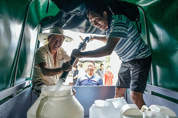 記者在現(xiàn)場(chǎng)看到,蘇建松開(kāi)車從水源點(diǎn)拉了兩大桶水送到村里,周邊的農(nóng)戶高興地提著水桶前來(lái)接水。他說(shuō),自己平時(shí)在鎮(zhèn)上經(jīng)營(yíng)夜宵店,白天時(shí)間比較寬裕,最近看到很多人送水十分辛苦,想來(lái)分擔(dān)一下,能夠幫助大家自己也感覺(jué)很開(kāi)心。