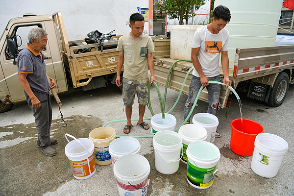 8月26日,在沿河縣譙家鎮(zhèn)譙家鋪村,志愿者在給缺水的村民送水。新華社記者楊文斌 攝