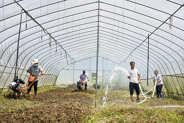 8月25日,在務(wù)川縣分水鎮(zhèn)過(guò)江社區(qū)的油菜育苗大棚內(nèi),村民正在澆地犁地。新華社記者楊文斌 攝