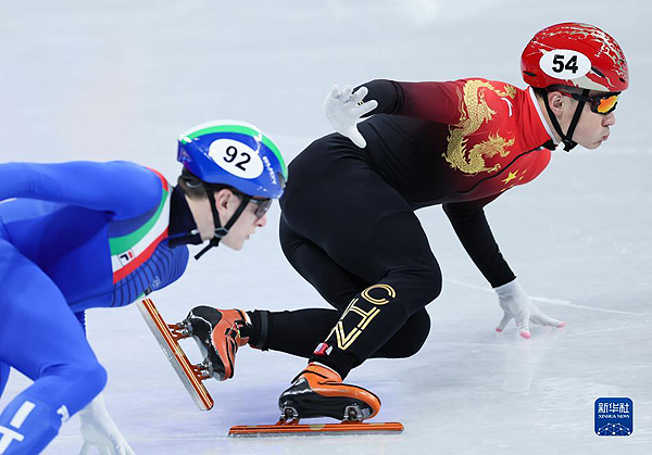 2022年2月5日,在首都體育館舉行的北京2022年冬奧會短道速滑項目混合團體接力決賽中,中國隊奪得冠軍。這是中國隊選手任子威(右)在比賽中。新華社記者 蘭紅光 攝