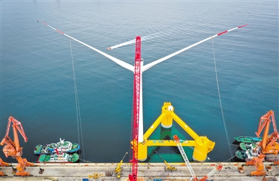 由中國船舶集團(tuán)海裝風(fēng)電股份有限公司牽頭,聯(lián)合相關(guān)單位自主研制的“扶搖號(hào)”浮式風(fēng)電機(jī)組浮體平臺(tái)上配備6.2兆瓦抗臺(tái)型I類風(fēng)力發(fā)電機(jī)組,在深遠(yuǎn)海應(yīng)用場將依靠九個(gè)對(duì)稱分布的懸錨鏈系泊實(shí)現(xiàn)固定。圖為完成總裝的國內(nèi)首臺(tái)深遠(yuǎn)海浮式風(fēng)電裝備“扶搖號(hào)”在茂名廣港碼頭靜待拖航(無人機(jī)照片)。記者 劉大偉 攝