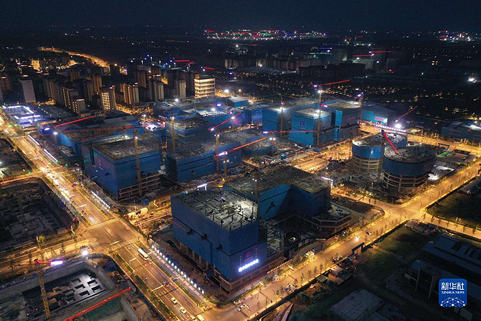 雄安新區(qū)容東片區(qū)雄安·電建智匯城建設(shè)項(xiàng)目夜景(2022年8月17日攝,無人機(jī)照片)。新華社記者 朱旭東 攝