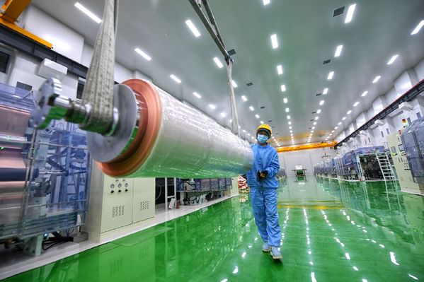 9月17日,山東省東營(yíng)經(jīng)濟(jì)開(kāi)發(fā)區(qū)合盛銅業(yè)公司工作人員在吊裝銅箔。