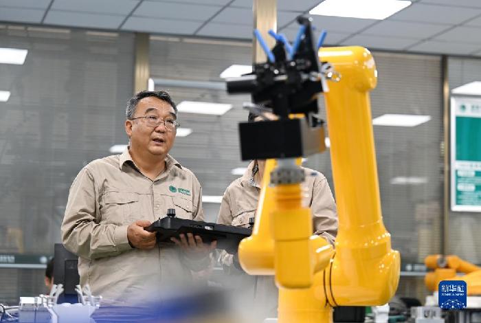 張黎明和同事在調(diào)試第四代配網(wǎng)帶電作業(yè)機(jī)器人(2022年9月8日攝)。新華社記者 趙子碩 攝