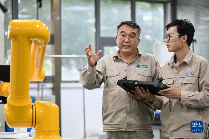 張黎明(左)和同事在調(diào)試第四代配網(wǎng)帶電作業(yè)機(jī)器人(2022年9月8日攝)。新華社記者 趙子碩 攝