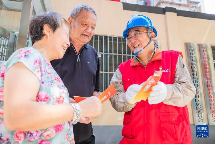 張黎明(右)在天津市濱海新區(qū)丹東里小區(qū)向居民宣講安全用電常識(shí)(2022年7月15日攝)。新華社發(fā)(李津攝)