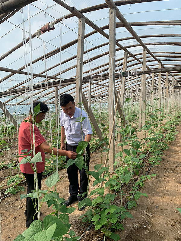 陽(yáng)谷村行微小一隊(duì)客戶經(jīng)理呂緒陽(yáng)在孫樓社區(qū)指導(dǎo)黃瓜掐花技術(shù)(資料照片)