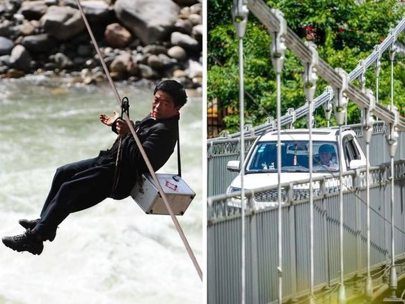 拼版照片:左圖為2011年2月20日,“溜索醫(yī)生”鄧前堆在怒江州福貢縣石月亮鄉(xiāng)拉馬底村溜索到江對岸出診(新華社記者秦晴攝)。右圖為2022年9月14日,鄧前堆出診歸來駕駛私家車過橋(新華社記者江文耀攝)。