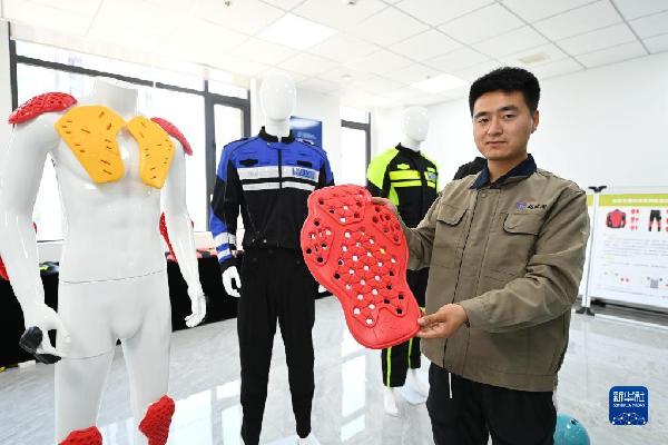 在位于秦創(chuàng)原總窗口所在地陜西省西咸新區(qū)的陜西拓銳考新材料科技有限公司,工作人員展示自主研發(fā)的納米智能吸能慢回彈護(hù)具(2022年6月17日攝)。新華社記者 李一博 攝