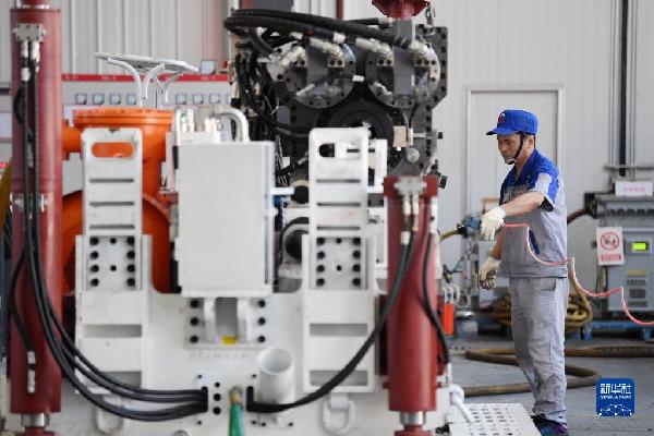 在位于秦創(chuàng)原總窗口所在地陜西省西咸新區(qū)的陜西太合智能鉆探有限公司,工人準(zhǔn)備對智能定向鉆機(jī)進(jìn)行性能調(diào)試(2022年6月17日攝)。新華社記者 李一博 攝