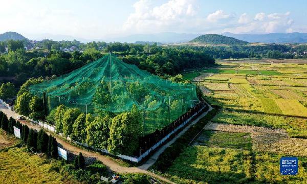 位于漢中市洋縣的陜西朱鹮人工繁育中心放飛大籠(2021年5月12日攝,無人機(jī)照片)。新華社記者 陶明 攝