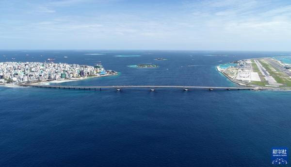 這是馬爾代夫連接首都馬累和機(jī)場島的中馬友誼大橋(2019年8月30日攝,無人機(jī)照片)。新華社發(fā)(王明亮攝)