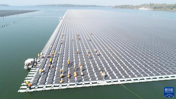 2021年1月23日,施工人員檢查中泰兩國聯(lián)合承建的泰國烏汶府詩琳通大壩綜合浮體光伏項(xiàng)目的太陽能板安裝情況。新華社發(fā)(泰國國家電力局項(xiàng)目組供圖)