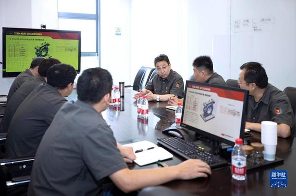 在位于寧夏吳忠市的吳忠儀表有限責(zé)任公司會(huì)議室內(nèi),馬玉山(中)與技術(shù)人員開會(huì)(9月12日攝)。 新華社記者 楊植森 攝