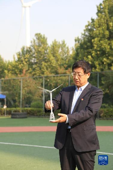 武鋼在位于北京經濟技術開發(fā)區(qū)的金風科技智慧園區(qū)內展示風機模型(2022年9月20日攝)。新華社發(fā)
