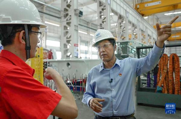 在金風科技新疆達坂城風電裝備產業(yè)基地零碳智能工廠內,武鋼(右)與技術工程師在一起交流(2022年8月6日攝)。新華社發(fā)