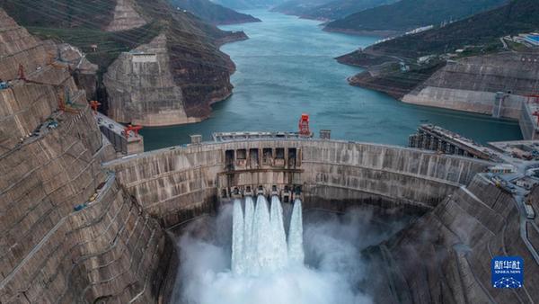 金沙江上,白鶴灘水電站,一座拱形大壩橫亙?cè)诟呗柕纳焦乳g,承受1650萬(wàn)噸的最大水推力。