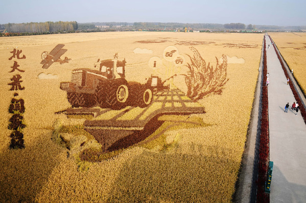 人們在北大荒集團閆家崗農(nóng)場有限公司農(nóng)業(yè)現(xiàn)代化示范區(qū)的稻田畫旁游玩。新華社記者 王建威 攝