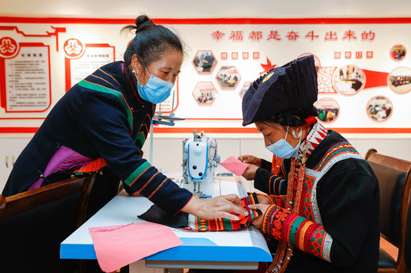 10月27日,在四川省涼山州昭覺縣南坪社區(qū)的彝繡工坊,易地扶貧搬遷到此的婦女在交流彝繡技藝。這個(gè)彝繡工坊有100多名繡娘,依照訂單制作彝族傳統(tǒng)服飾制品,繡娘們?cè)诖遂`活就業(yè),既能為家庭增收,又方便照顧家中老人和孩子,每年可增收數(shù)千至上萬元。