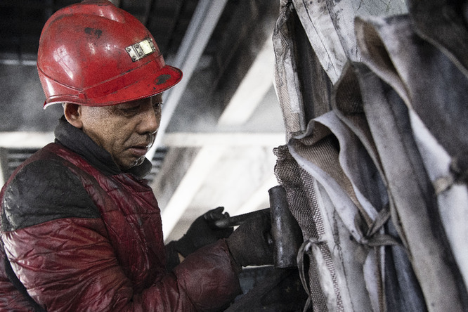 在龍煤雞西礦業(yè)公司城山礦洗煤廠洗煤車間,工人在更換壓濾機濾板上的零件。記者 張濤 攝