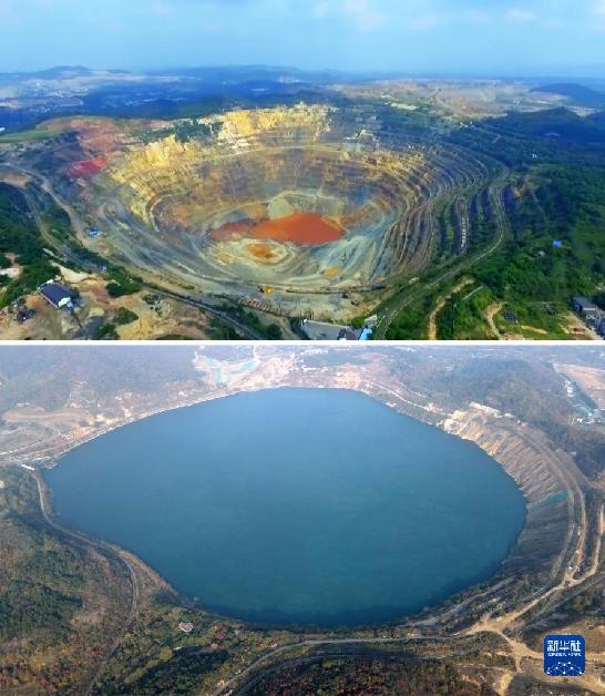 拼版照片:上圖為開采中的安徽省馬鞍山市雨山區(qū)向山鎮(zhèn)凹山采場(chǎng)(資料照片),下圖為生態(tài)修復(fù)后的凹山采場(chǎng)(新華社記者劉軍喜11月8日攝,無(wú)人機(jī)照片)。新華社發(fā)