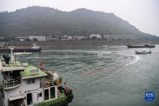 11月9日,在四川省宜賓市敘州區(qū)的長(zhǎng)江流域突發(fā)生態(tài)環(huán)境事件應(yīng)急綜合演練現(xiàn)場(chǎng),多方部門協(xié)作在金沙江面布設(shè)圍油欄。新華社記者 王曦 攝