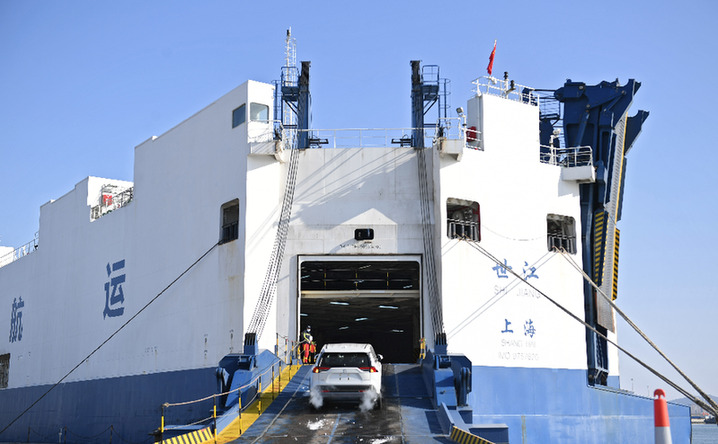一艘滾裝船準(zhǔn)備裝載一批國產(chǎn)小轎車出口海外。資料照片