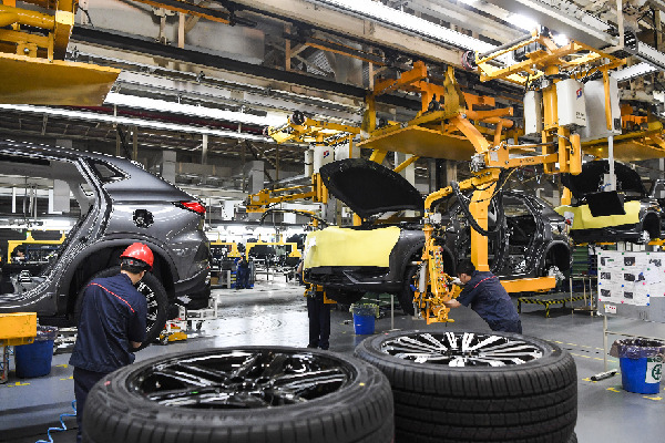 長(zhǎng)安汽車重慶兩江智能工廠工作人員在生產(chǎn)車間內(nèi)作業(yè)。