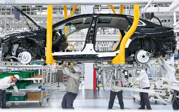 在吉林省長春市中國第一汽車集團(tuán)有限公司紅旗繁榮工廠,工人在總裝車間的生產(chǎn)線上裝配車輛(2022年10月17日攝)。新華社記者 顏麟蘊 攝