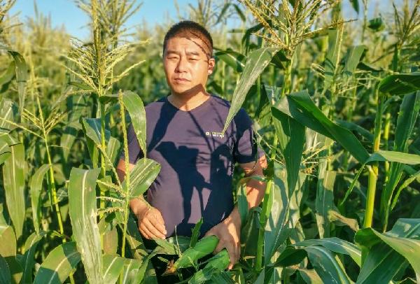 2022年7月26日,在吉林省梨樹縣北夏家村,邵亮亮檢查玉米長勢。(受訪者供圖)