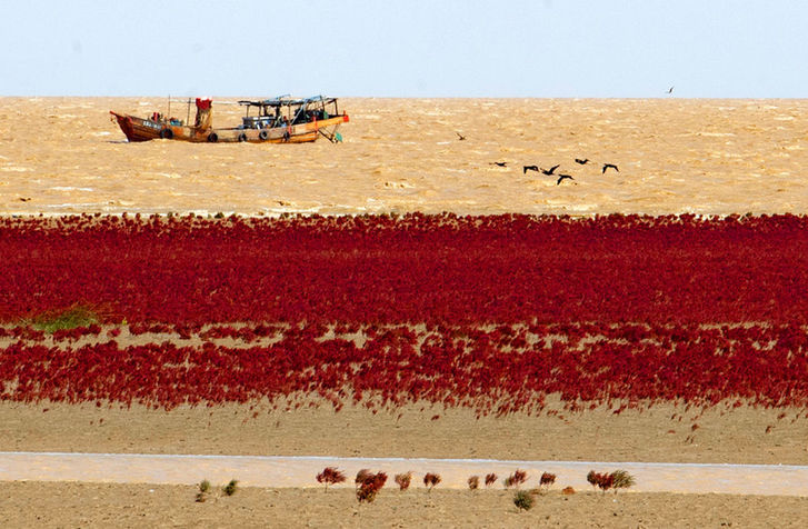 翅堿蓬給黃河口濱海灘涂濕地鋪上“紅地毯”。記者 范長(zhǎng)國(guó) 攝