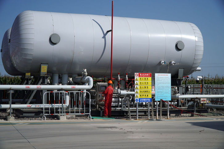 齊魯石化—?jiǎng)倮吞锇偃f(wàn)噸級(jí)碳捕集、利用與封存項(xiàng)目10號(hào)注氣站,一名工作人員在檢查設(shè)備。記者 徐速繪 攝