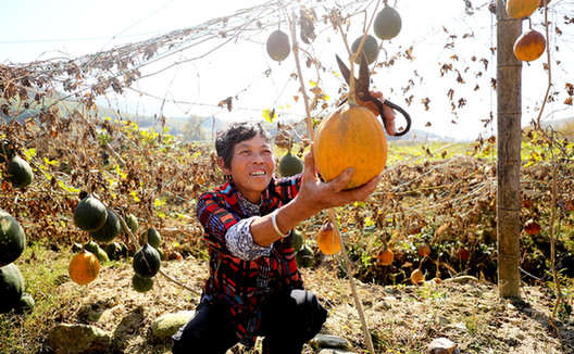 江西省蔞豐農(nóng)業(yè)科技發(fā)展有限公司黎川縣洵口鎮(zhèn)皮邊村瓜蔞基地,農(nóng)戶(hù)在采摘成熟的瓜蔞。(王武輝 攝)